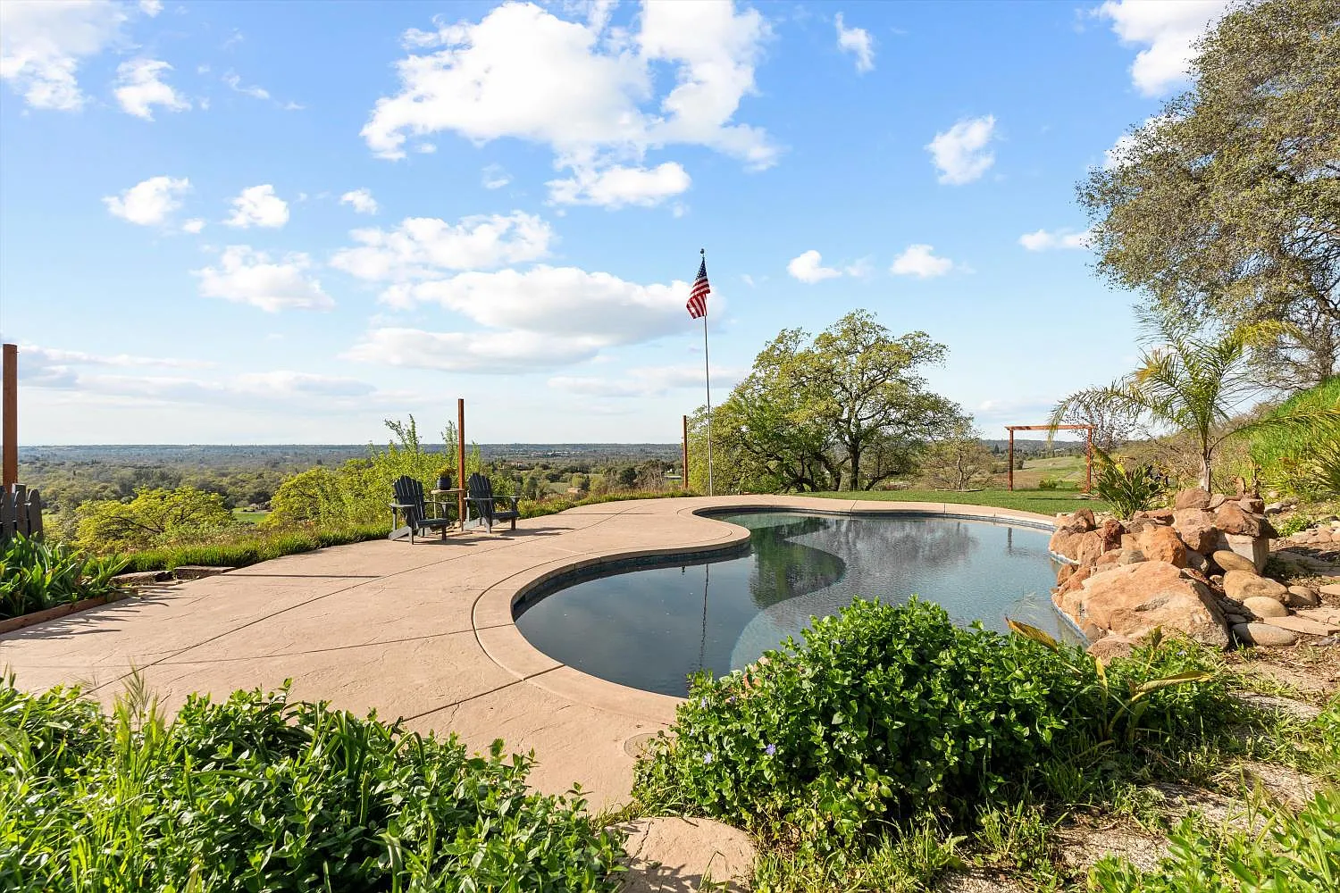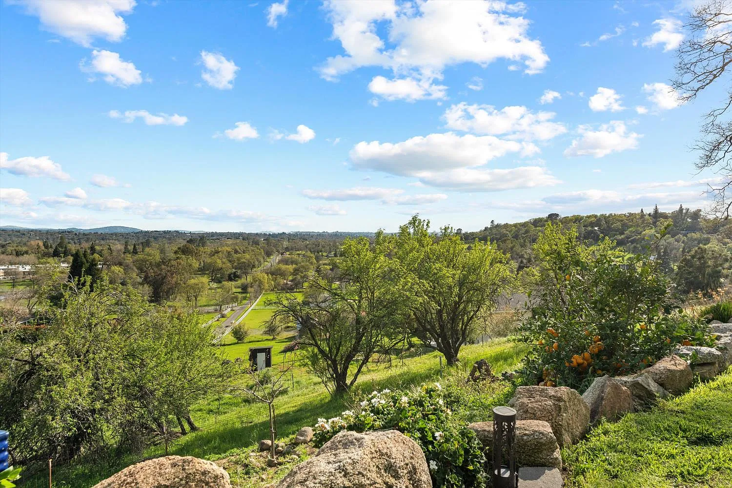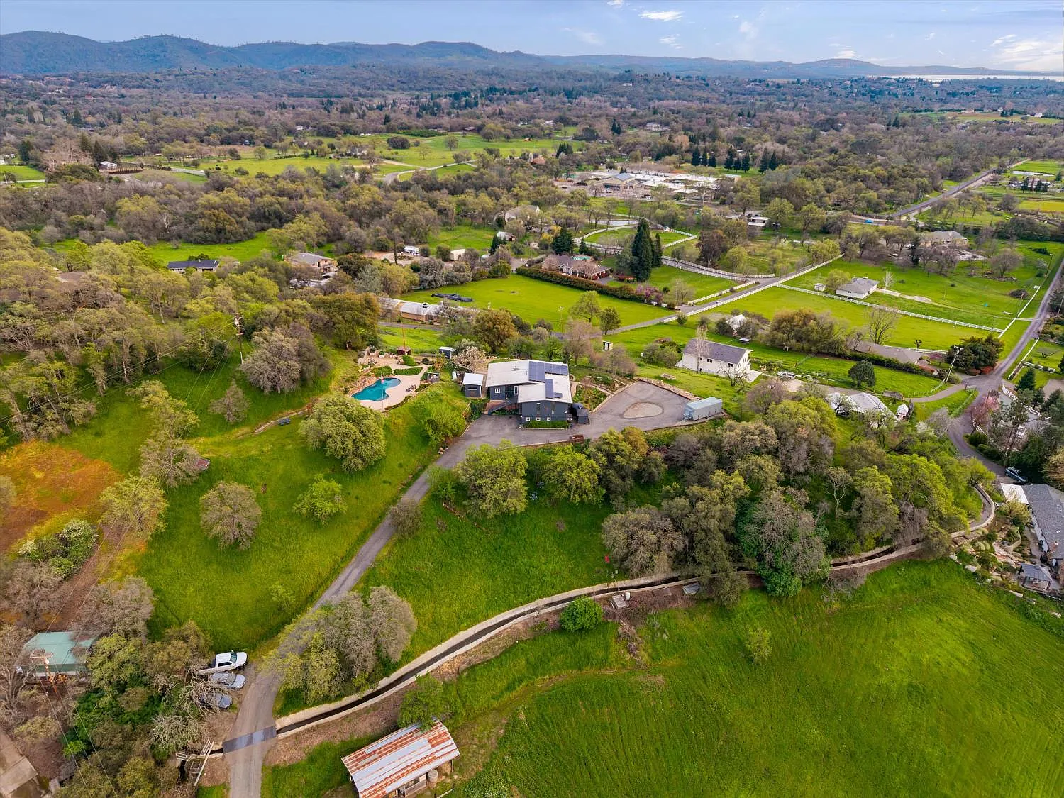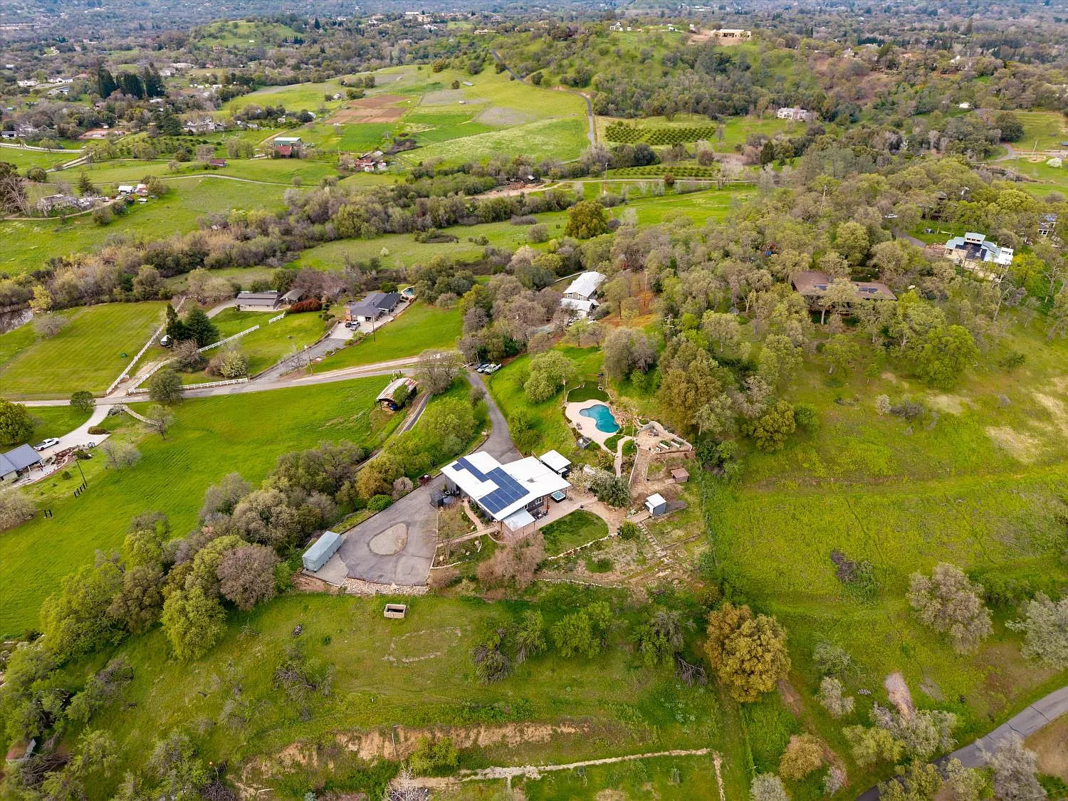 Perched atop a gentle rise in the heart of Loomis, this exceptional estate captures its most breathtaking feature from the very first glance phenomenal hillside views framed by a lush, beautifully landscaped setting. From sunrise to sunset, sweeping vistas and rolling greenery create a serene, private backdrop that makes this property truly unforgettable. Mature trees and manicured grounds enhance the sense of tranquility while offering expansive space to relax and unwind. Nestled on nearly 4 private acres, the 4-bedroom, 2-bathroom home blends luxury with country living. Spacious interiors are filled with natural light and designed for both comfort and entertaining. The chef's kitchen flows seamlessly into inviting dining and living areas, ideal for gatherings or quiet evenings at home. Flexible bedroom and bathroom layouts support multigenerational living or hosting guests with ease. Outdoors, a stunning swimming pool anchors your private oasis, complemented by open areas for gardens, hobbies, or entertaining. Barn structures add versatility for equestrian use, storage, or workshops, while ample room for RVs and toys completes this peaceful yet conveniently located retreat.