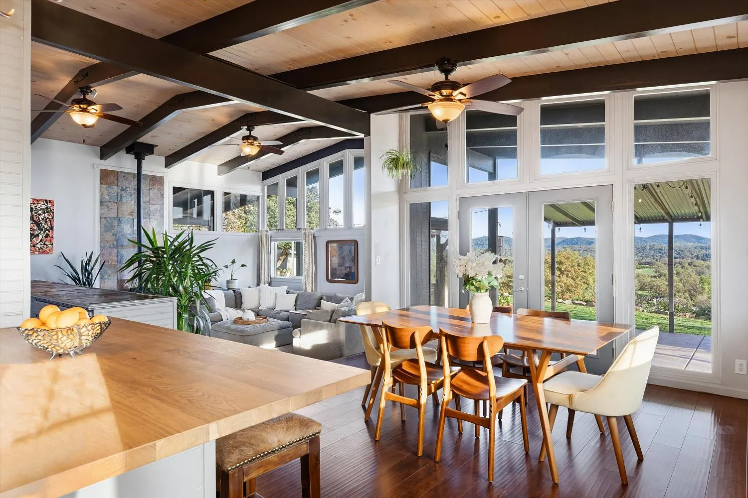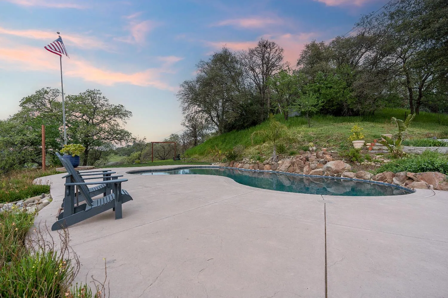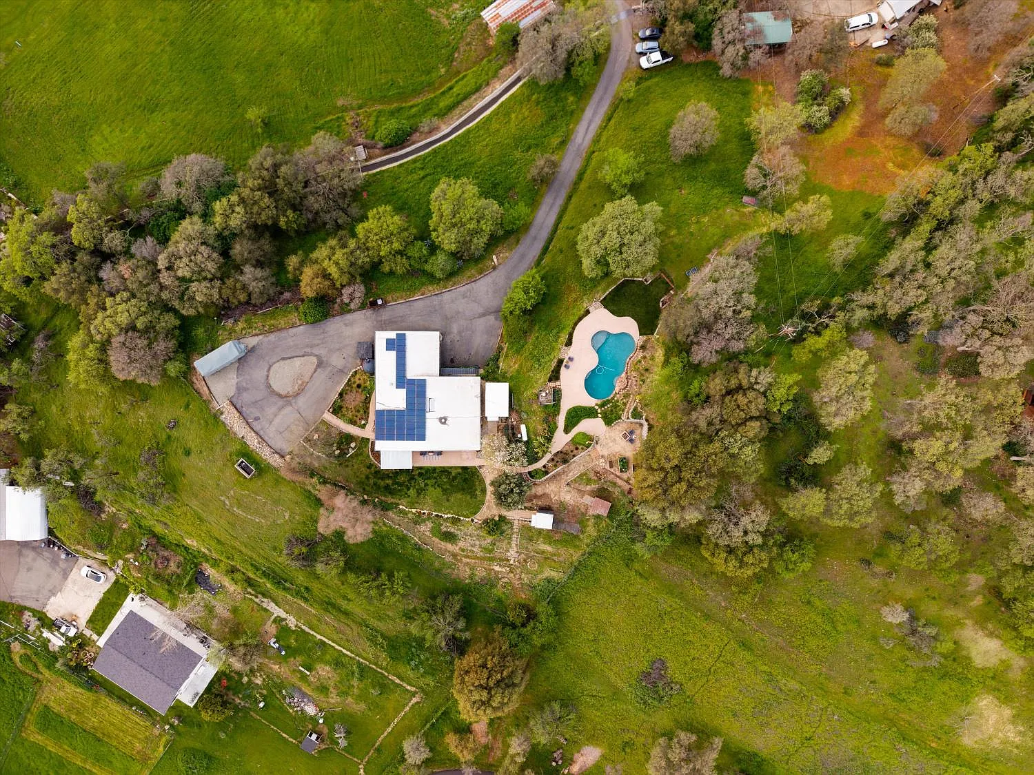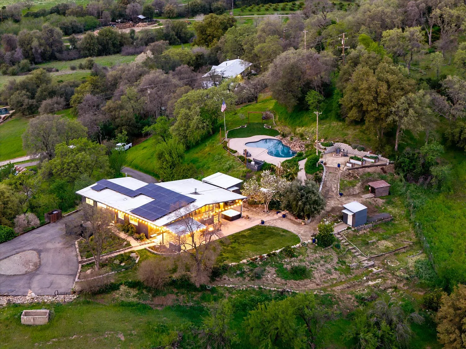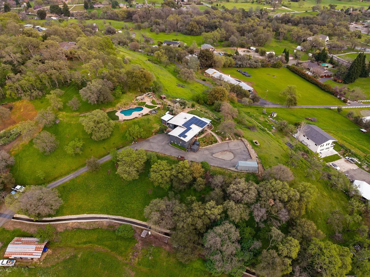 Perched atop a gentle rise in the heart of Loomis, this exceptional estate captures its most breathtaking feature from the very first glance phenomenal hillside views framed by a lush, beautifully landscaped setting. From sunrise to sunset, sweeping vistas and rolling greenery create a serene, private backdrop that makes this property truly unforgettable. Mature trees and manicured grounds enhance the sense of tranquility while offering expansive space to relax and unwind. Nestled on nearly 4 private acres, the 4-bedroom, 2-bathroom home blends luxury with country living. Spacious interiors are filled with natural light and designed for both comfort and entertaining. The chef's kitchen flows seamlessly into inviting dining and living areas, ideal for gatherings or quiet evenings at home. Flexible bedroom and bathroom layouts support multigenerational living or hosting guests with ease. Outdoors, a stunning swimming pool anchors your private oasis, complemented by open areas for gardens, hobbies, or entertaining. Barn structures add versatility for equestrian use, storage, or workshops, while ample room for RVs and toys completes this peaceful yet conveniently located retreat.